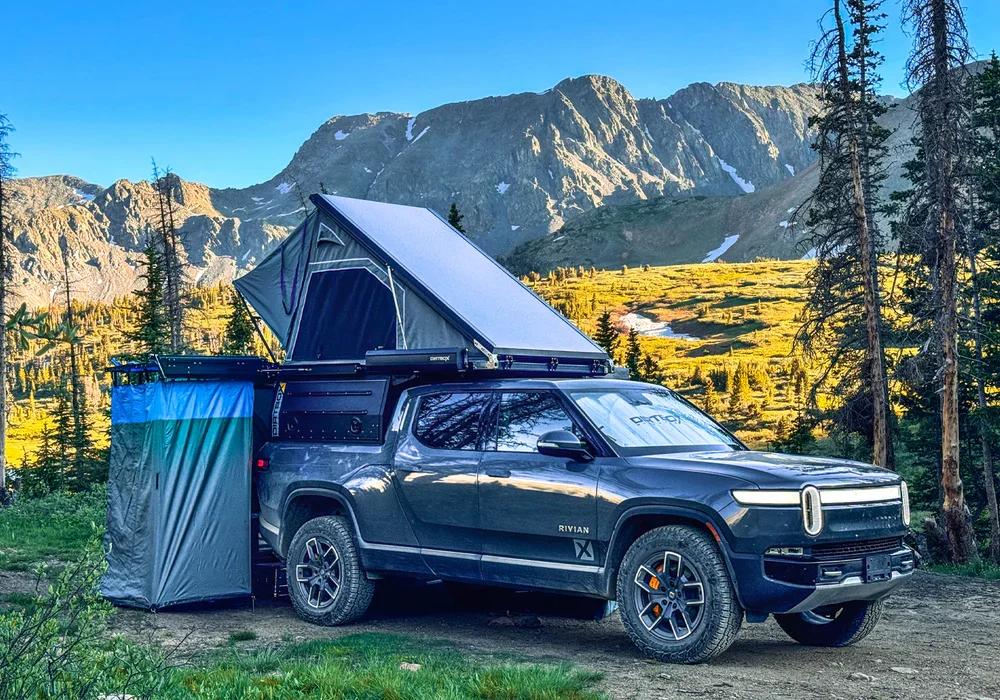 An insulated wedge‑style pop‑up shell for lightweight trucks, deployable in around 30 seconds, with room to stand and 100 lb roof load capacity; Starts at $13,200